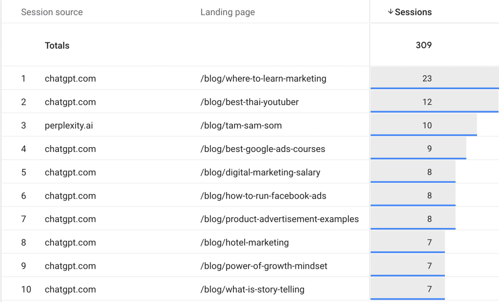 จากตารางนี้จะเห็นได้ว่า ChatGPT และ Perplexity คือแหล่งหลักที่ส่ง Traffic เข้ามา และยังสามารถวิเคราะห์ต่อได้ว่า AI เหล่านี้พาผู้ใช้ไปยัง Content ประเภทไหนมากที่สุด